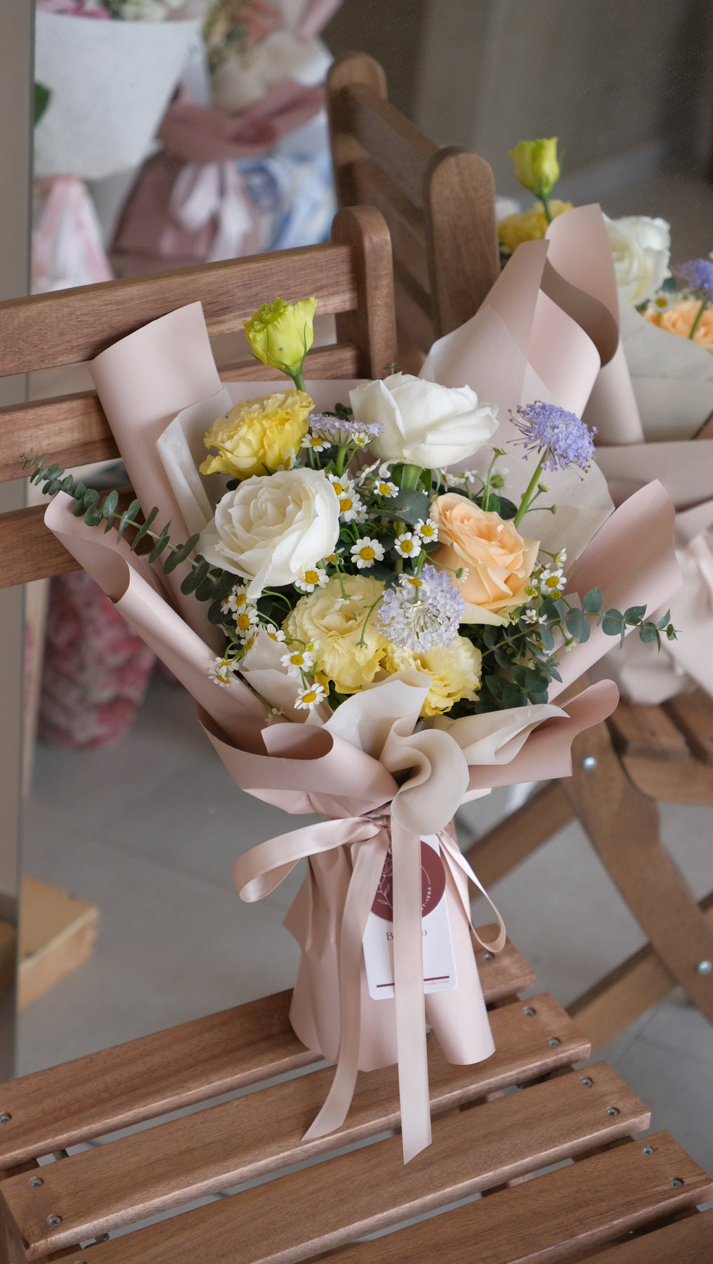 Want a sweet surprise? Try this fresh bouquet designed by florist with a mixture of 3 roses, eustoma & chamomile delivered straight to your door.