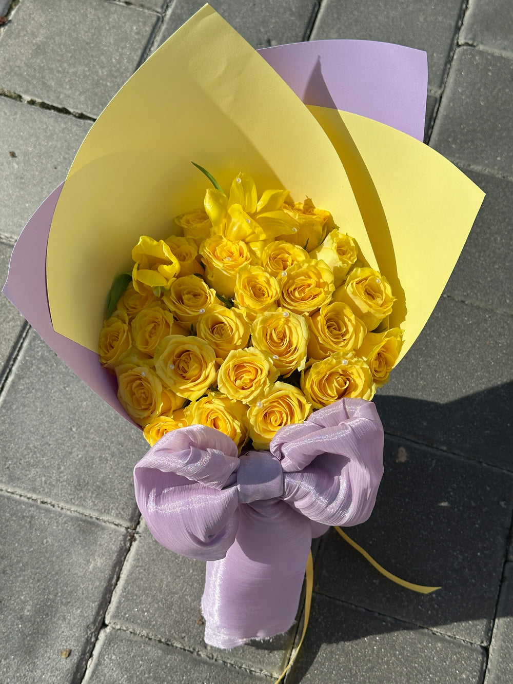 Our newest color-blocking crush — bold yellow roses, sculpted wrap in purple, and the sweetest chiffon bow.