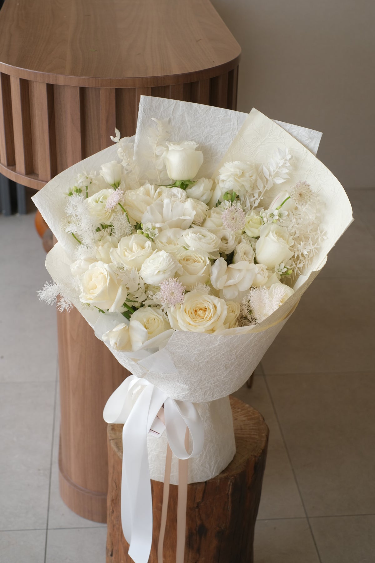 Be swept away by an all-white symphony of pristine roses, tulips, and seasonal blooms — a timeless symbol of pure love and elegance.