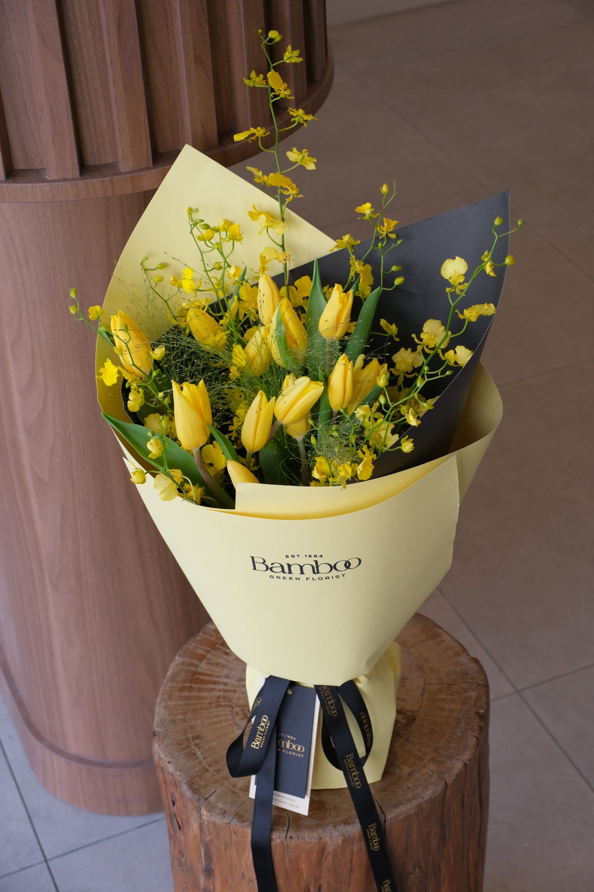 A radiant blend of yellow tulips and yellow dancing lady orchids, each stem arranged to capture light, warmth, and effortless grace.