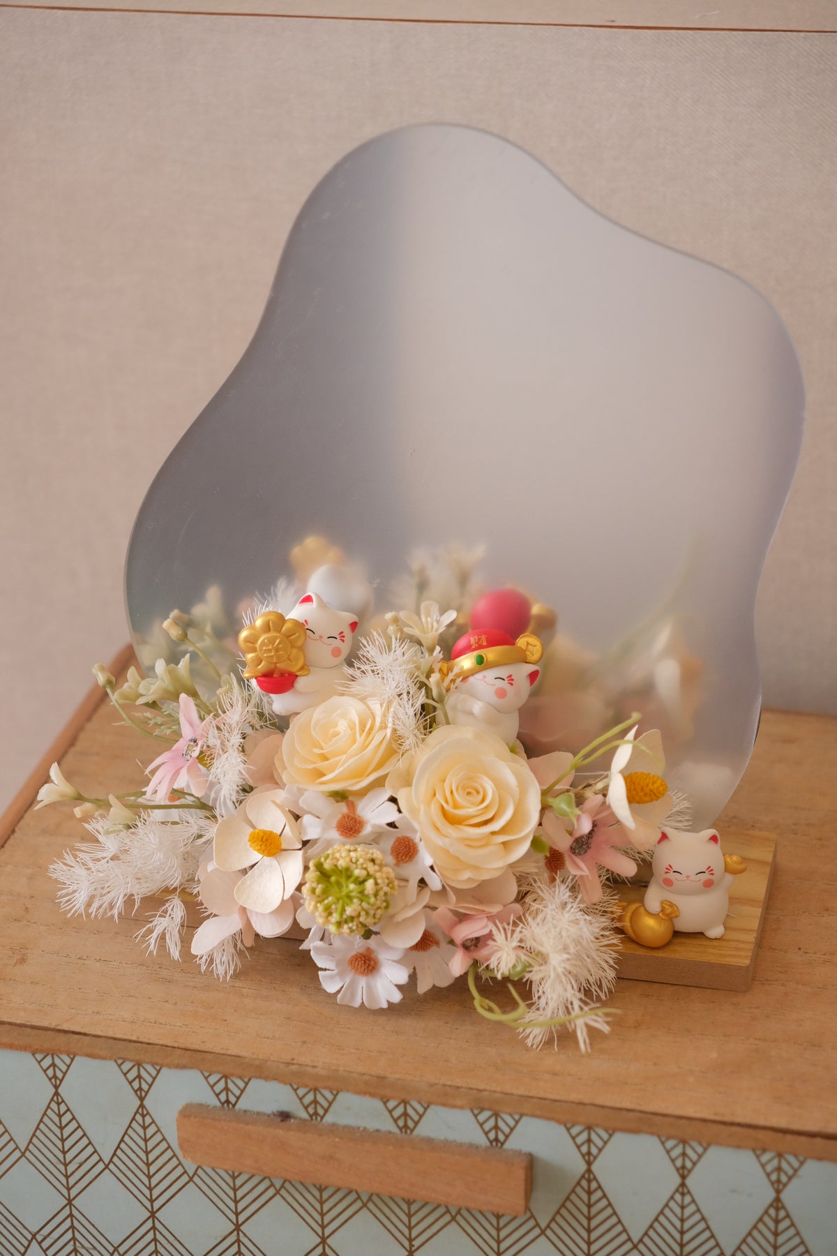 The Golden Mew is a sophisticated blend of modern lines and traditional joy. This irregular cloud-like mirror is accompanied by a lively trio of prosperity cats and golden ingots (元宝). Set within warm champagne roses, it creates a balanced, eye-catching display that complements any setting.