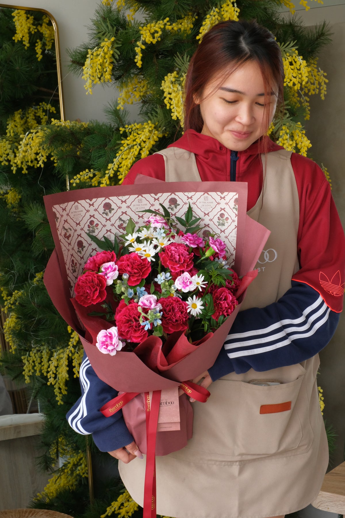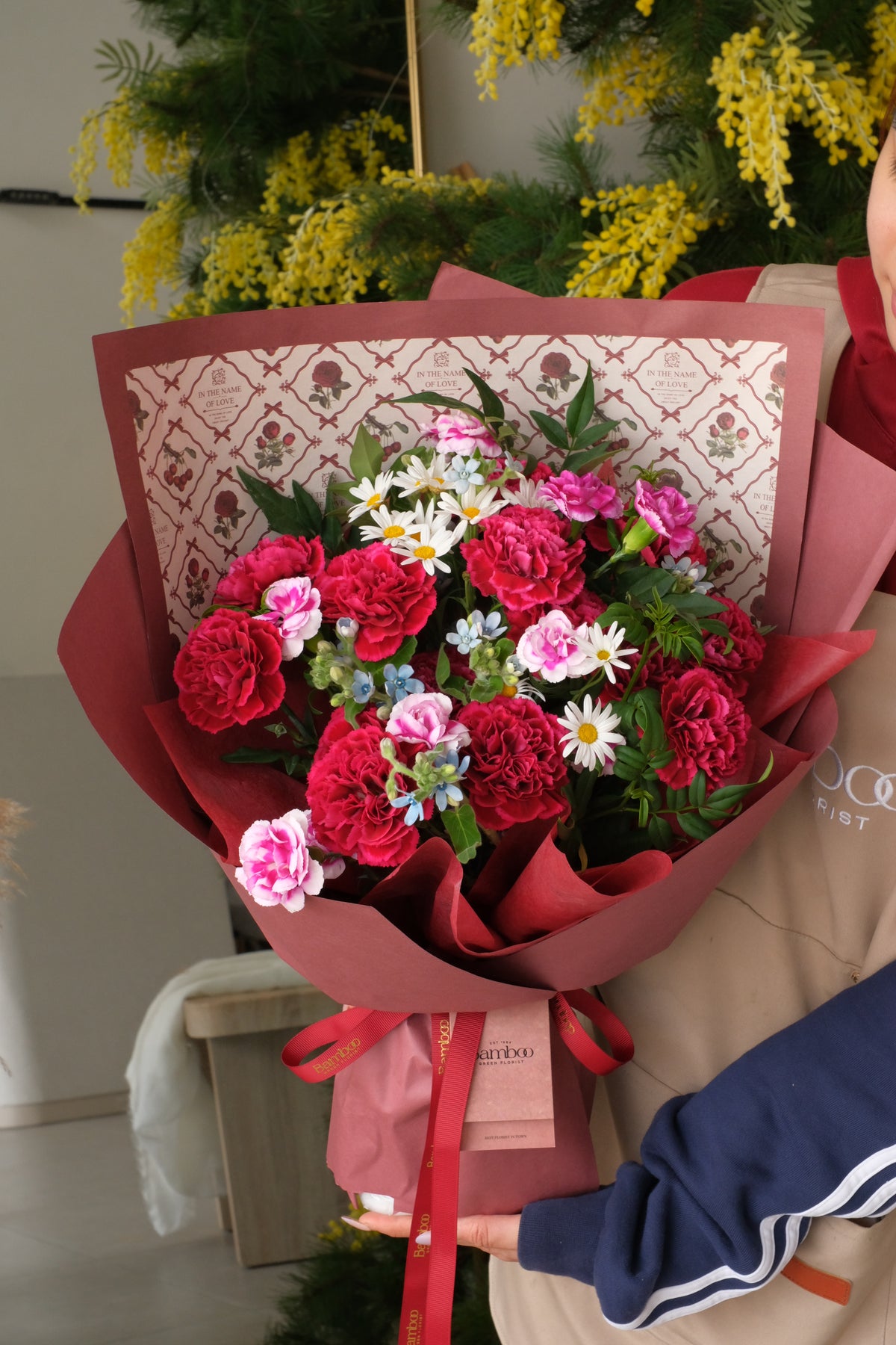 A bold blend of deep red carnations, purple mini carnations and hints of blue and white, designed to feel seen and loved.