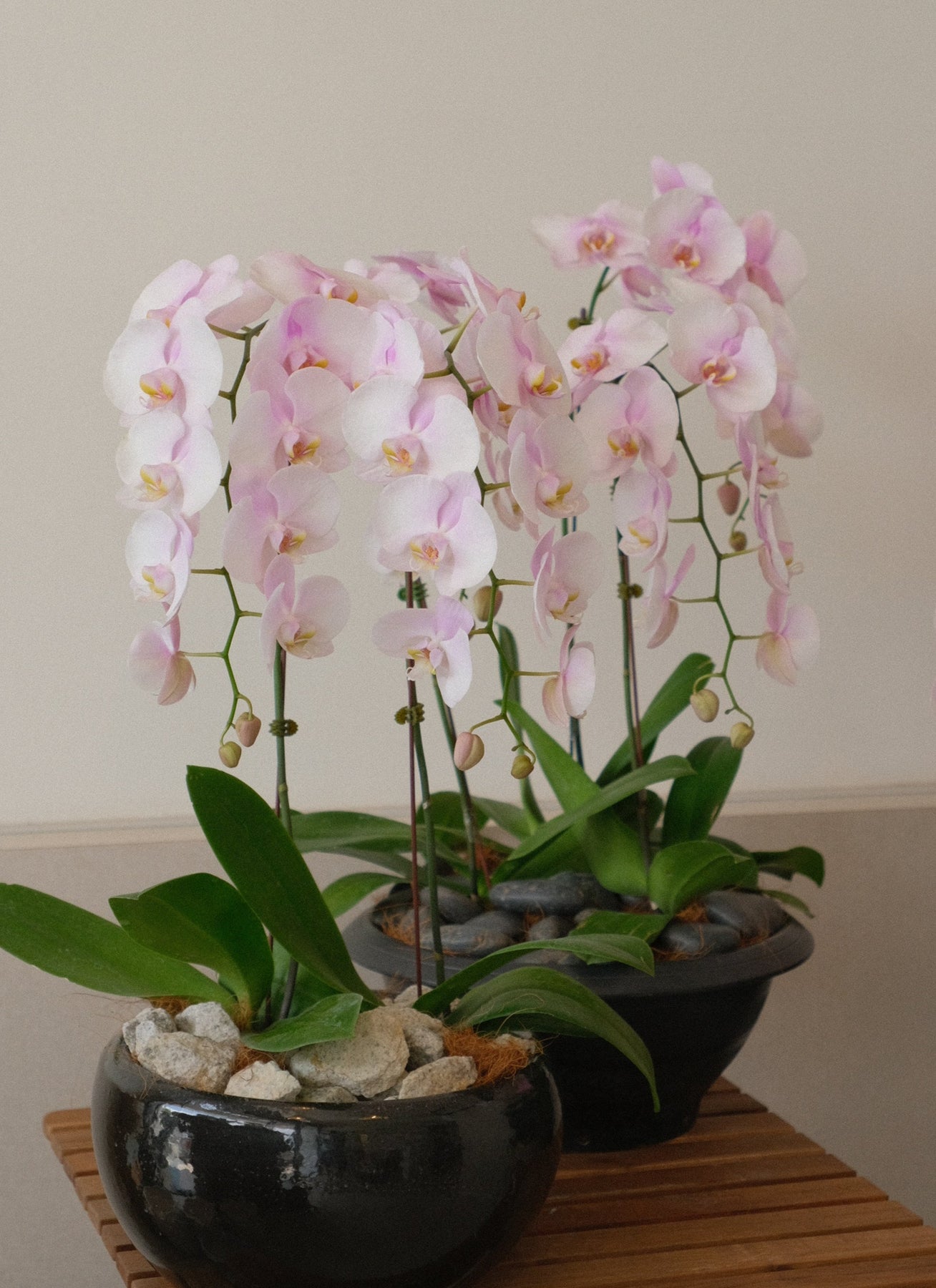Adorn your living spaces with the grace of fresh blooming phalaenopsis orchids in a planter base, finishing with teal and fuschia palette that's both playful and sophisticated, effortlessly transitions from casual to formal occasions