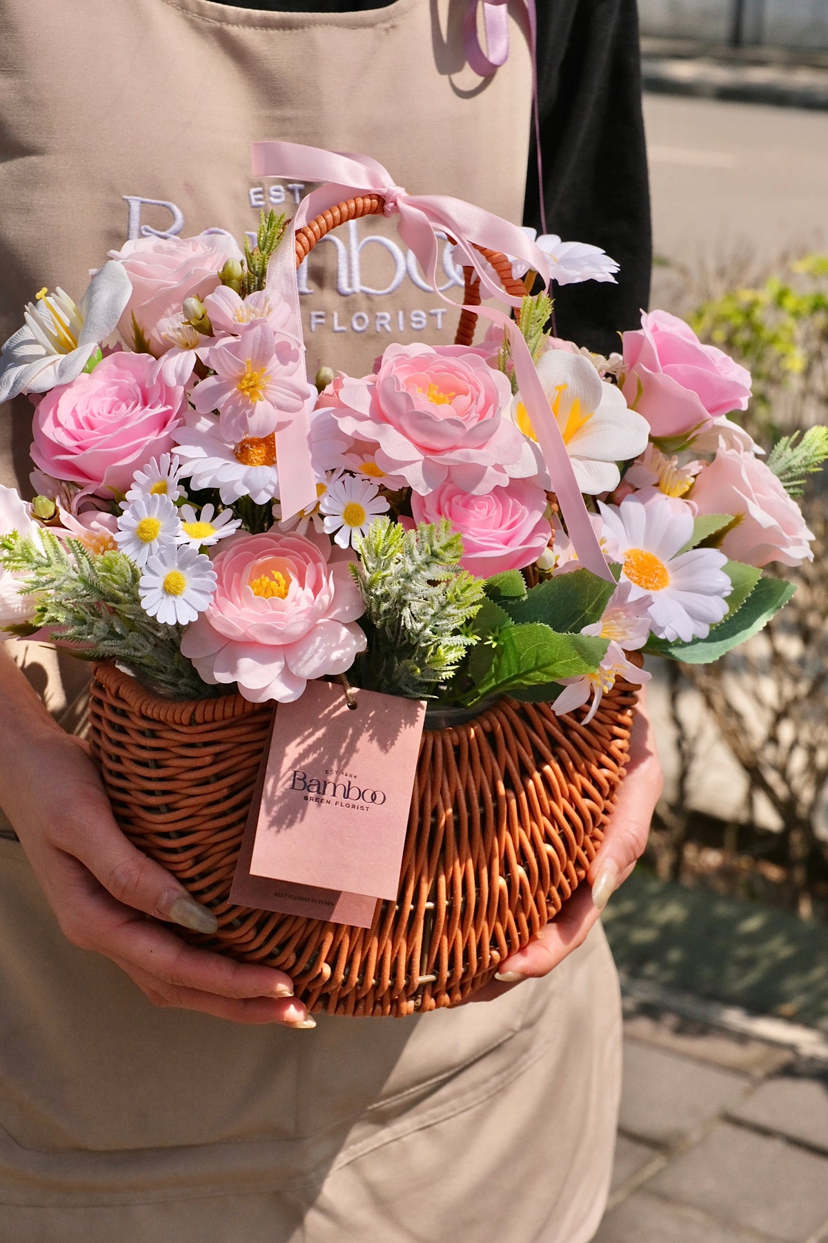 At the heart of The Bloom Basket is a handcrafted, premium artificial floral arrangement. A variety of soft pink roses and vibrant daisies are carefully selected and arranged within a rustic woven basket to create a visually stunning centerpiece. These flowers are chosen not only for their beauty but also for their symbolism in expressing joy, success, and well wishes for a new beginning.