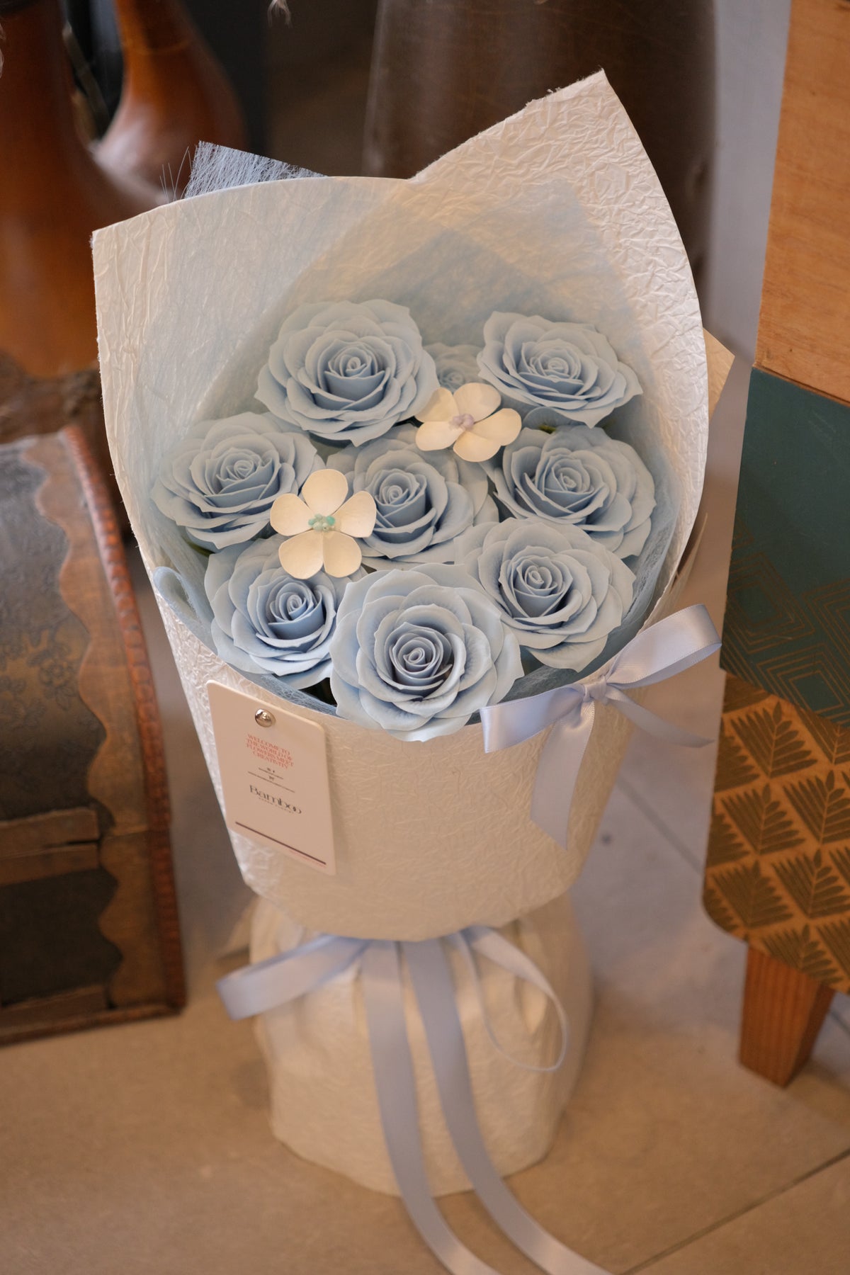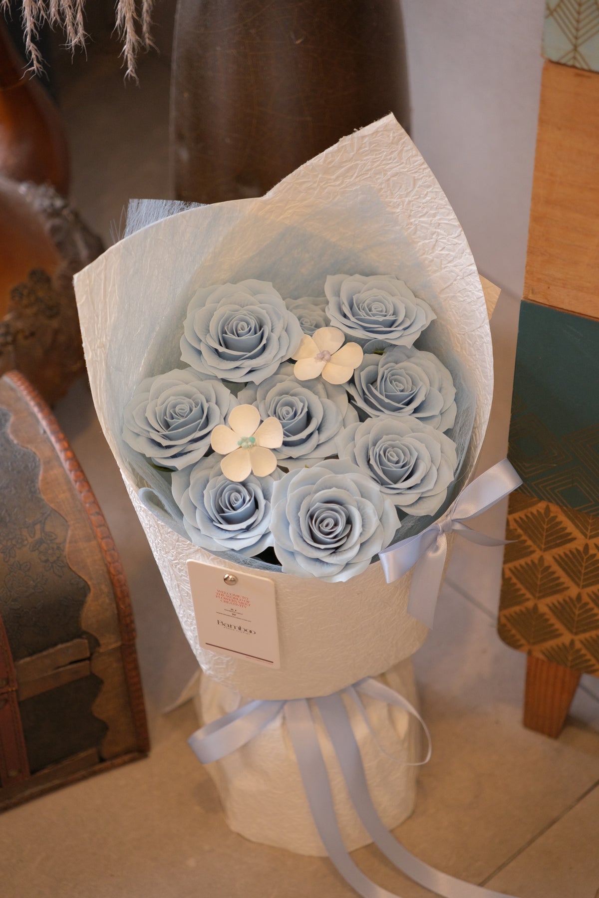 A dreamy, pastel-blue bouquet that stays beautiful forever.