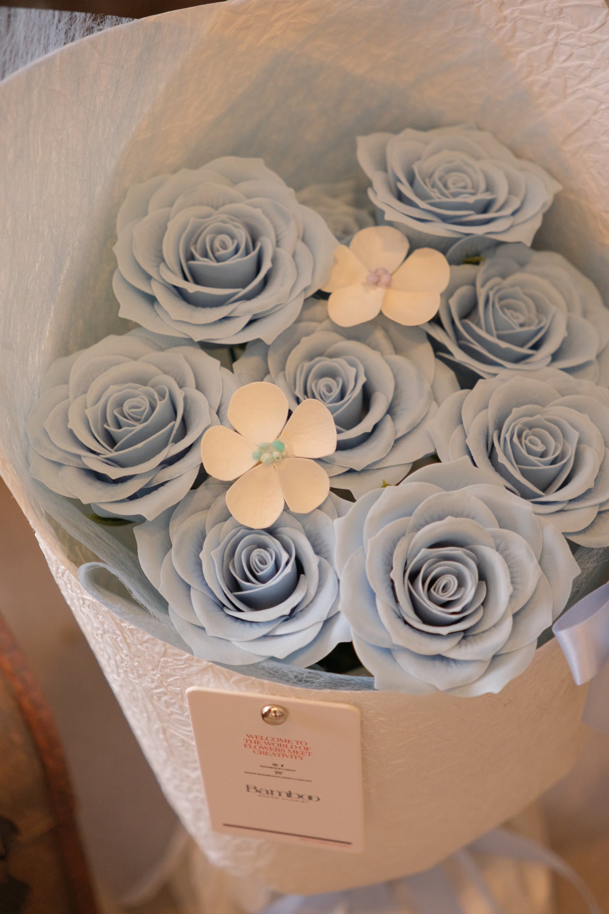 Meet Cloudberry, a soft and sweet arrangement featuring delicate powder-blue soap roses accented with petite white florals. Wrapped in textured white paper and finished with matching blue ribbons, Cloudberry feels clean, airy, and irresistibly cute — like a little cloud you can hold.
