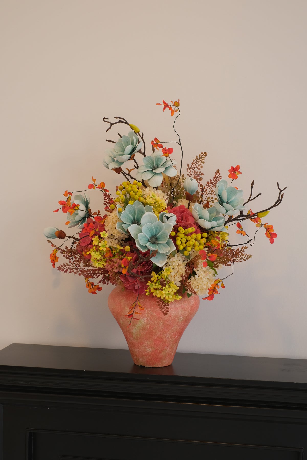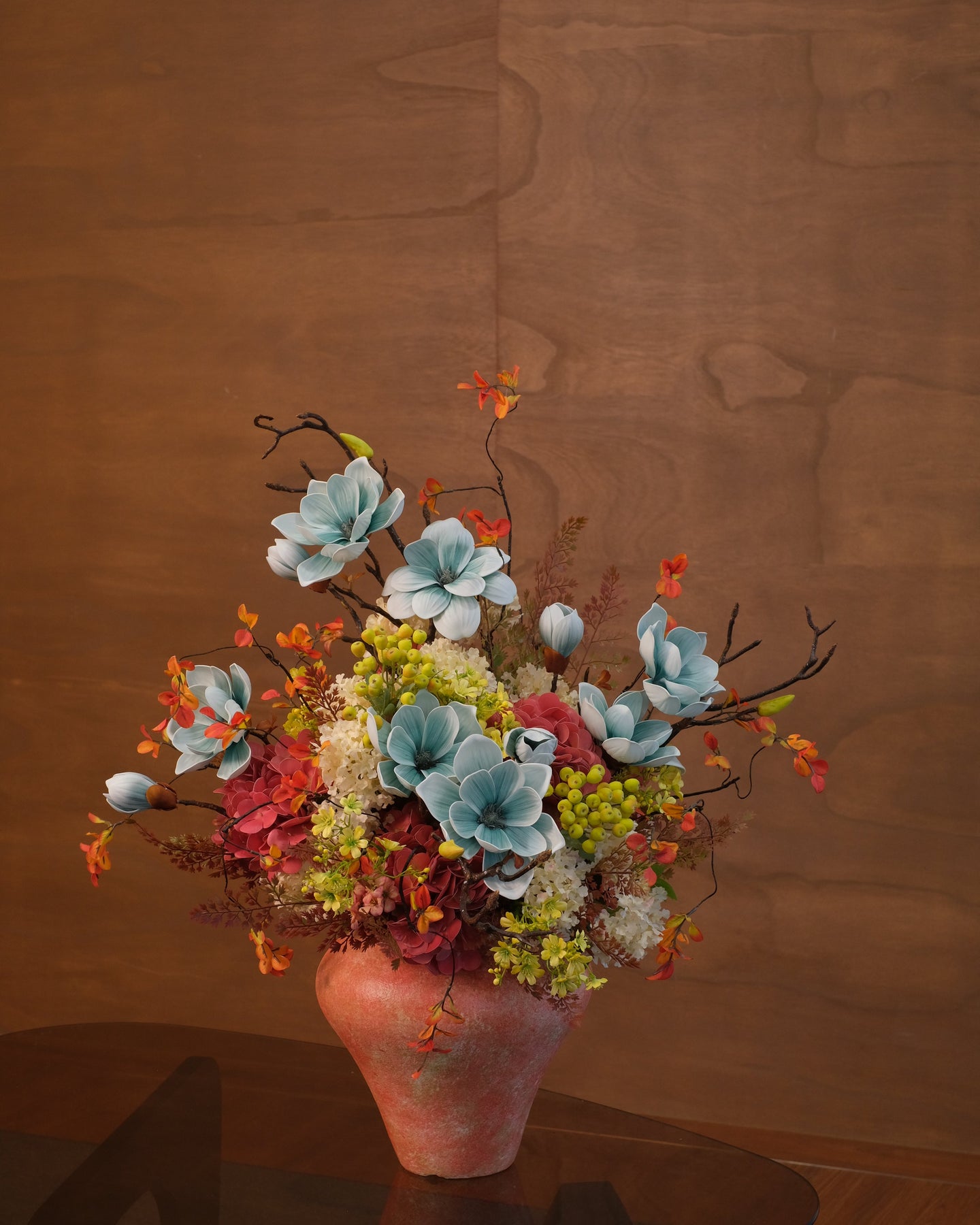 Set in a vibrant orange pot, this premium artificial floral arrangement features striking blue magnolia 玉兰花, paired with layers of colourful festive florals. The contrast of cool blues against warm tones creates rhythm and movement — a composition that feels lively yet composed.