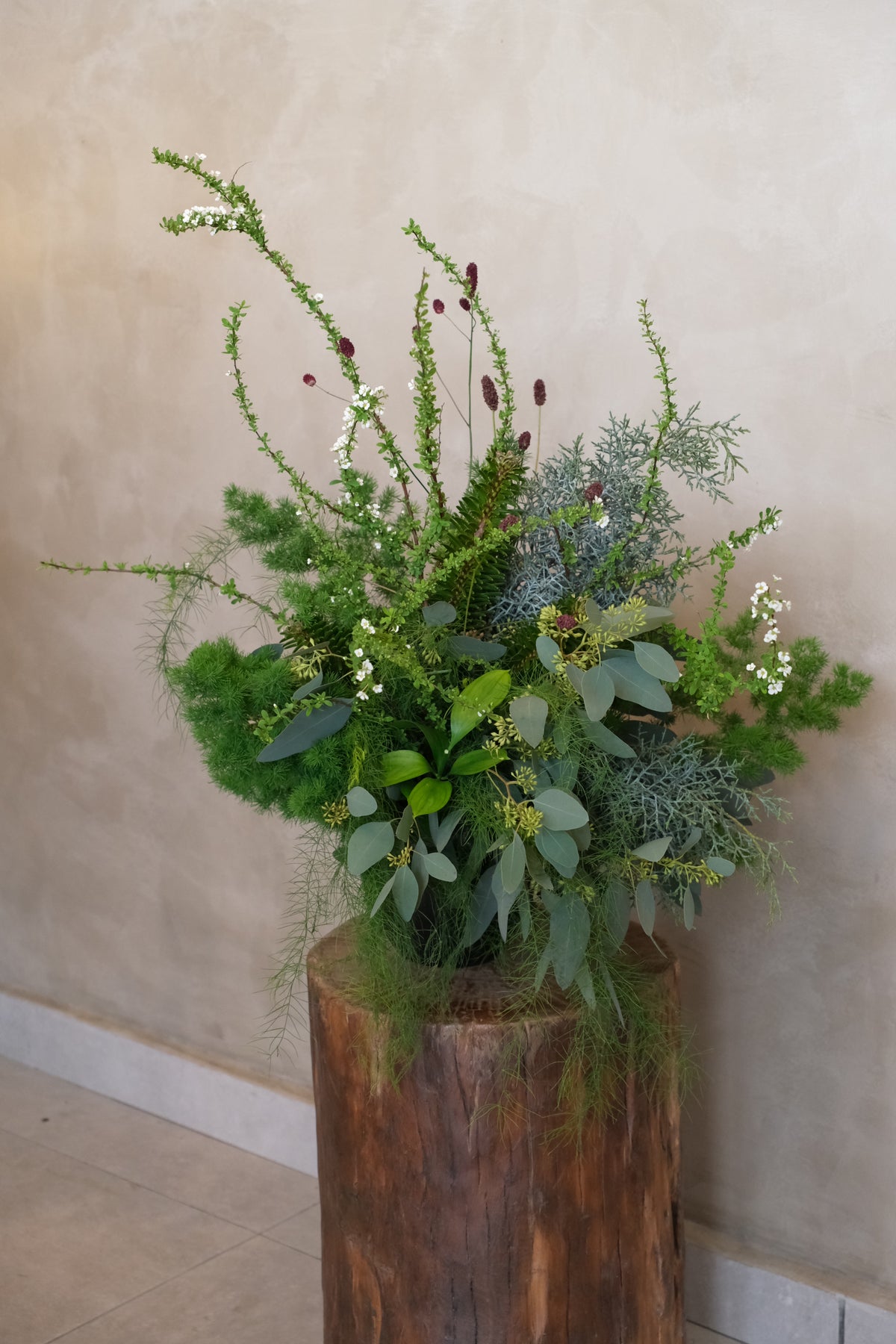 This bespoke Omakase arrangement is composed with fresh greens and tonal foliage, curated to express movement, texture, and quiet balance. Rather than focusing on colour, the design highlights natural lines, layered greens, and organic form — allowing the arrangement to feel grounded, calm, and intentional.